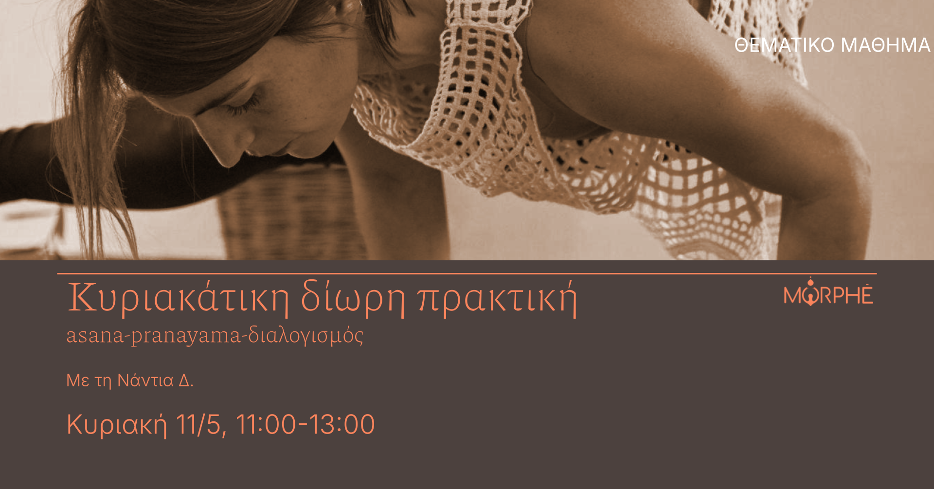 Την Κυριακή 11/5, 11:00-13:00, σας προσκαλούμε σε μία πρακτική απλή και ουσιαστική. Το σώμα θα κινηθεί, η αναπνοή θα διευρυνθεί, ο νους θα περάσει τα στάδιά του, το συναίσθημα θα αναδυθεί. Μια πρακτική που θα προσφέρει χρόνο, ησυχία και χώρο.